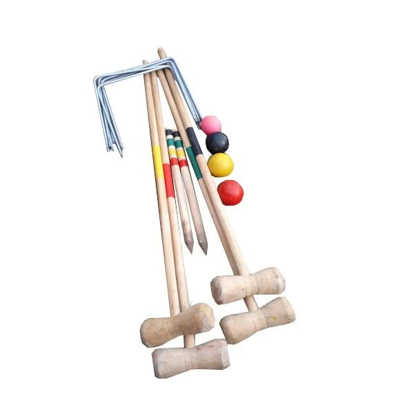 Versuchen Sie, den Ball mit dem Holzstab mit möglichst wenigen Schlägen durch die Tore zu schlagen. Spaß für Jung und Alt.