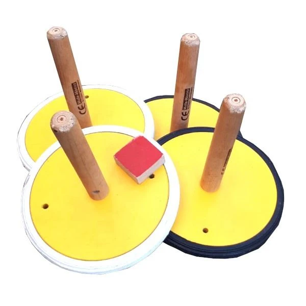 Sie können auf einer harten Oberfläche spielen. Die Version für den Außenbereich ist mit Kunststoff verkleidet. Die Holzstangen sind ca. 22 cm hoch und haben einen Gummipuffer in Weiß und Schwarz. Es gibt also ein weißes und ein schwarzes Team.