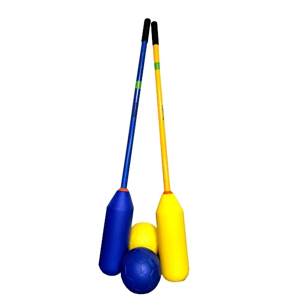 Unser Club-Hockey-Set besteht aus 6 blauen und 6 gelben Schlägern und 2 Softbällen.