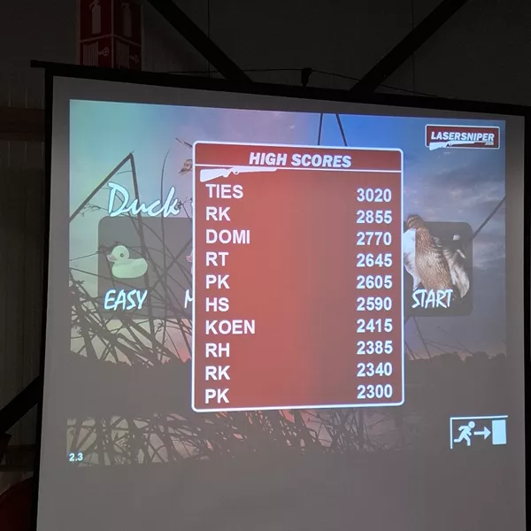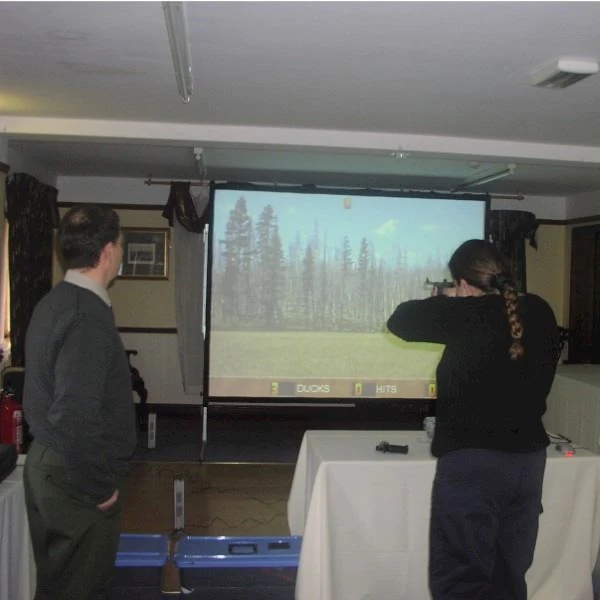 Laser Tontaubenschießen wird auf einer großen Projektionsfläche gespielt, auf der die Spieler ihre Waffen abfeuern.
