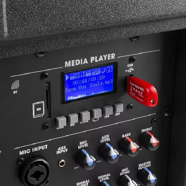 - 🎚️ Anschlüsse für Mikrofon, Mischpult und Mediaplayer