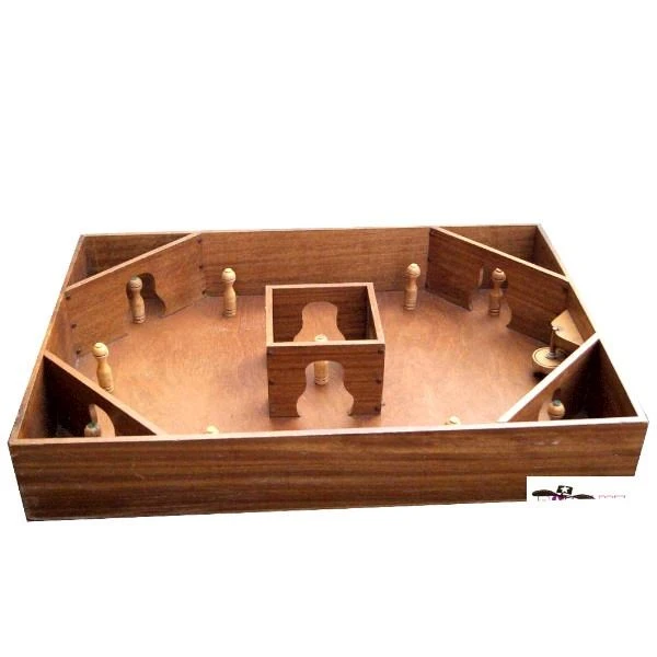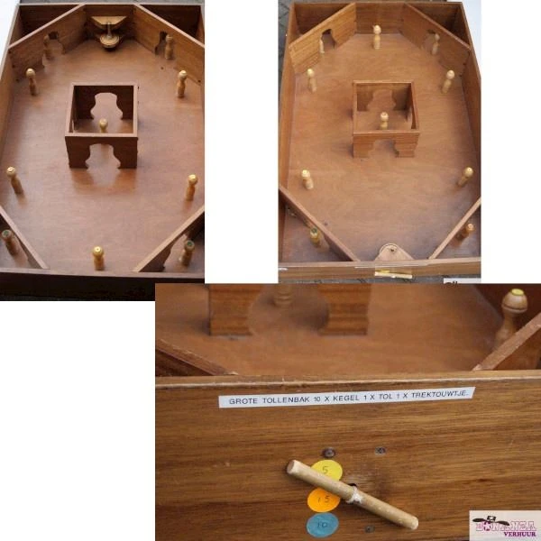 Platzieren Sie alle 10 Zapfen auf den dafür vorgesehenen farbigen Punkten. Wickeln Sie das Seil um die Tol durch das Loch. Ziehen Sie dann fest an der Schnur des Tol. Die Tol wird ihren Weg in den Spiel finden und eine Reihe von Kegeln umwerfen.
