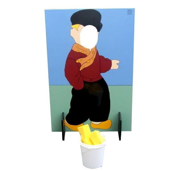Stellen Sie sich hinter der Platte und schauen Sie durch das Loch. Lassen Sie die anderen den Schwamm werfen und der Wasserspaß beginnt!